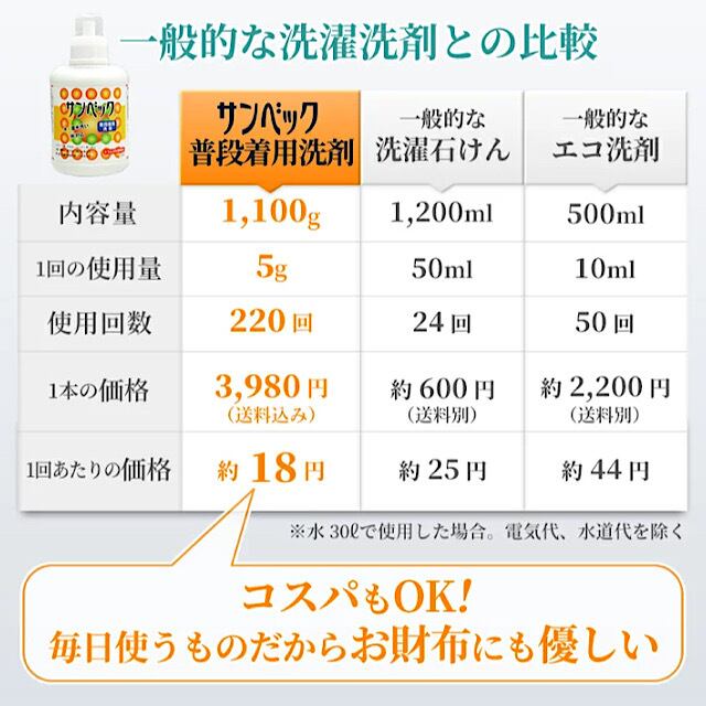 (水30ℓに洗剤5g使用で1回あたり約18円!)